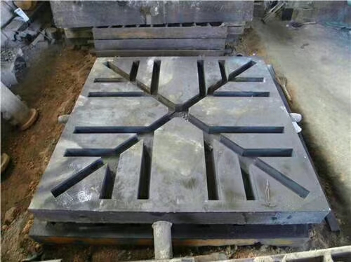 底板是鑄錠設備的主要部分,用生鐵鑄成, 在凹坑處安放中心分流磚。中心分流磚的上口與中注管相接,而其側(cè)口與底板溝 槽 中的流鋼磚 相 接,底板上的凹坑與溝槽的尺寸決定于中心分流磚和流鋼磚的尺寸,并留以 10 - 15mm 富裕量.